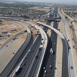 The Loop 202 South Mountain Freeway Project comprises 42 bridges and 22 miles of improved mobility via four lanes in each direction – three general-use lanes and one High-Occupancy Vehicle (HOV) lane – and includes modern features such as rubberized asphalt and aesthetics that reflect nearby communities. The project also includes a freeway-to-freeway interchange, including approximately five miles of tie-in work on I-10 Papago Freeway.